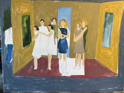 2 of 9 a work in progress. Exploring about being the 2nd child of my biological parents. The figures on the left are my maternal side. The central figure is me. The two figures on the right are my paternal side. Sometimes when I make an initial statement on the canvas I will observe it for a long time, I think I become attached to it as it is and then I am unwilling to take it any further.